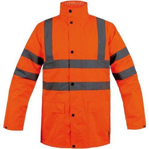 Veste de pluie hautevisibilité Everglades T2S Coloris : Orange fluo Genre : Mixte Grammage : 150 g/m² Matière textile : Polyester Norme : ISO 20471 Classe 3 Norme EN : EN 343 Taille : XXL Type de vêtement : Veste et gilet de travail Respirante et imperméable : tissu Oxford 150D imperrespirant avec une enduction PU 100% polyester (150 g/m²). Doublure fixe en maille ajourée et manches doublées taffetas pour un confort optimal. Une protection totale contre les intempéries : coutures étanchées, capuche fixe doublée, bas de manches ajustable par un bouton pression. Bandes rétroréfléchissantes microbilles RETHIOTEX® pour une visibilité optimale. Elle peut être portée seule ou avec le pantalon de pluie EVERGLADES. Veste de pluie hautevisibilité Everglades, Type de vêtement: Veste et gilet de travail, Matière: Polyester, Coloris: Orange fluo, Taille: XXL, Grammage: 150 g/m², Genre: Mixte