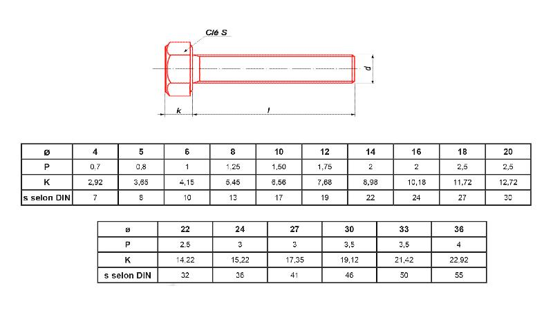 Caractéristiques techniques : Type de vis : vis à métaux.Type de tête : hexagonale.Classe : 8.8.Filetage total.Finition : brut.Norme :DIN 933.